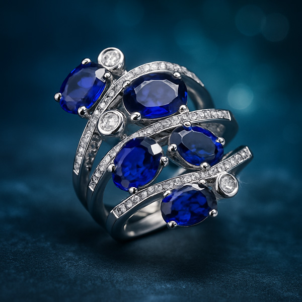 Een witgouden ring van het merk PonteVecchio, model Lune, bezet met briljant geslepen diamanten met een totaal gewicht van ca. 0,34 crt. en 5 ioliet edelstenen met een totaal gewicht van ca. 4,90 crt.