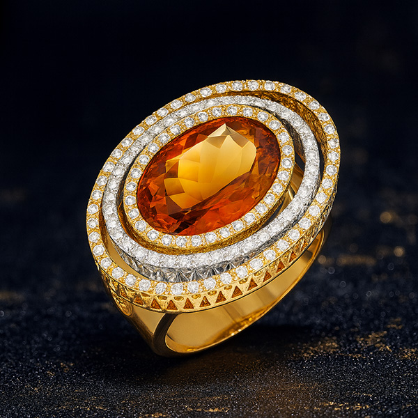 A yellow golden ring from our housecollection, model PonteVecchio, set with brilliant cut diamonds with a total weight of approx. 0,64 crt. en 1 citrine gemstone with a weight of approx 5,10 crt.