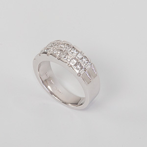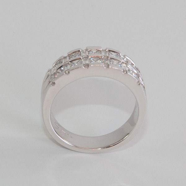 Een witgouden ring uit onze huiscollectie, bezet met 10 princess geslepen diamanten met een totaal gewicht van ca. 0,90 crt. en 12 baquette geslepen diamanten met een totaal gewicht van ca. 0,38 crt.
