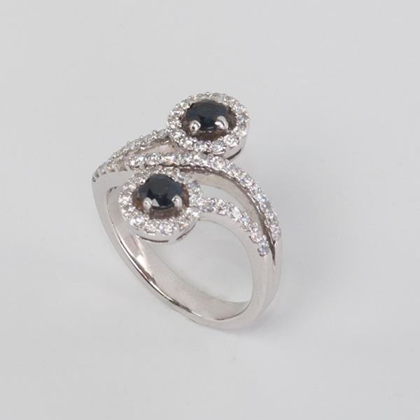 A white golden ring from our housecollection, set with brilliant cut diamonds with a total weight of approx. 0,66 crt. en 2 sapphires with a total weight of approx 0,56 crt.