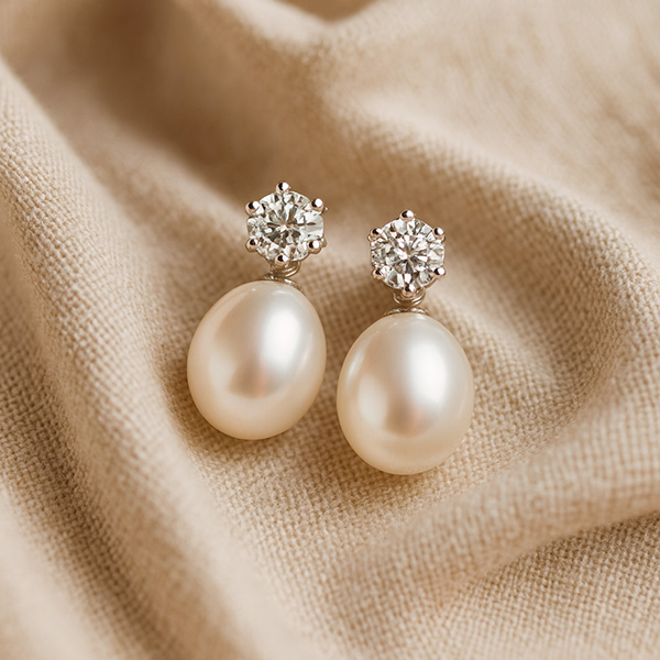 A white golden earring from our housecollection, set with 2 brilliant cut diamonds with a total weight of approx. 2,03 crt. en 2 pearls.
