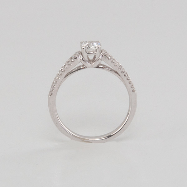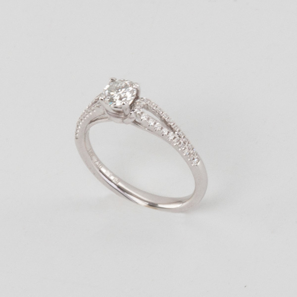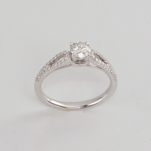 A white golden ring from our housecollection, set with 46 brilliant cut diamonds with a total weight of approx. 0,17 crt. en 1 brilliant cut diamond with a total weight of approx. 0,42 crt.