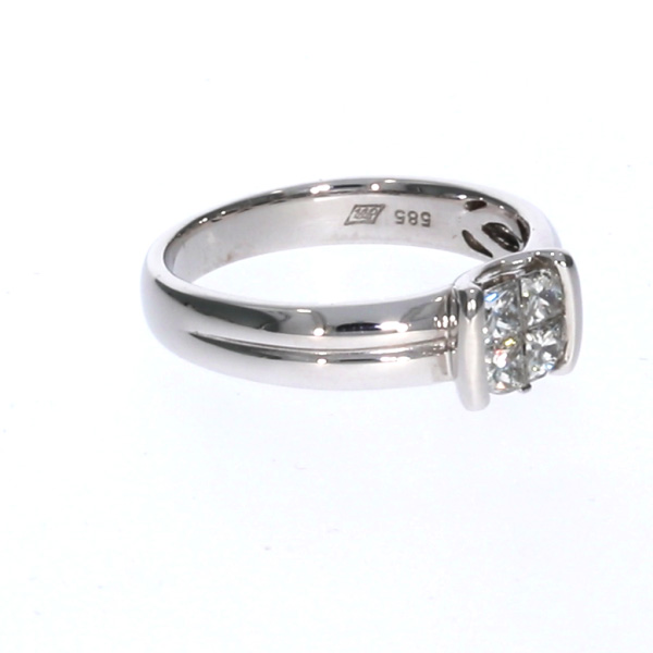 Een witgouden ring uit onze huiscollectie, bezet met 4 princess geslepen diamanten met een totaal gewicht van ca. 0,51 crt.