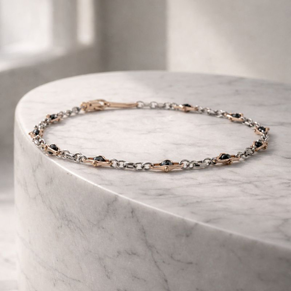 Een wit- met rozegouden armband uit onze huiscollectie, bezet met zwarte diamanten met een totaal gewicht van ca. 2,00 crt.