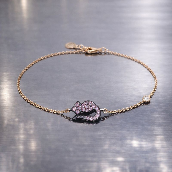 Een rozegouden armband uit onze huiscollectie, bezet met 1 briljant geslepen diamant met een totaal gewicht van ca. 0,02 crt. en rose/paarse kleurstenen