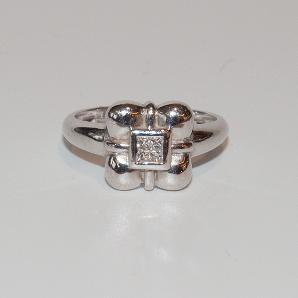 Een witgouden ring uit onze huiscollectie, bezet met 4 princess geslepen diamanten met een totaal gewicht van ca. 0,11 crt.