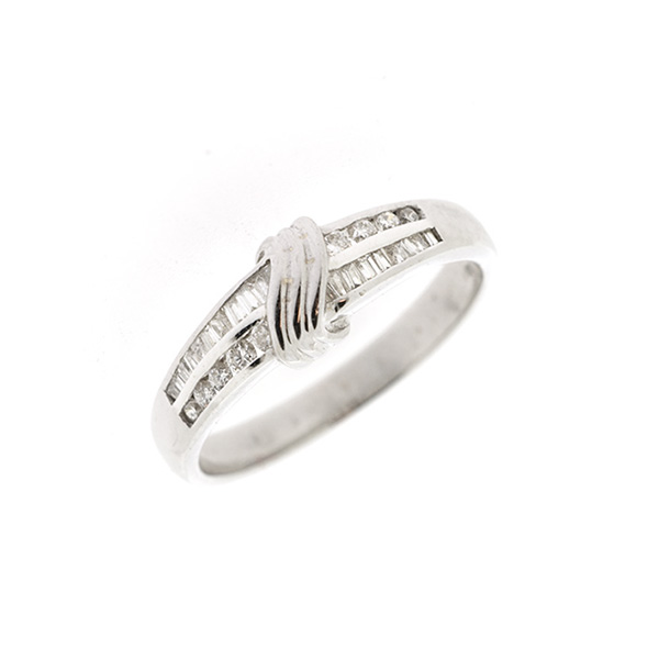 Een witgouden ring uit onze huiscollectie, bezet met 9 briljant geslepen diamanten met een totaal gewicht van ca. 0,13 crt. en 20 baquette geslepen diamanten met een totaal gewicht van ca. 0,21 crt.