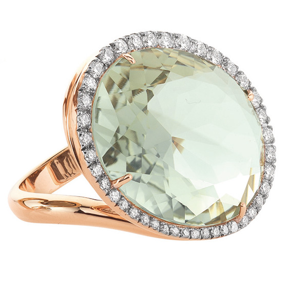 Een rozegouden ring uit onze huiscollectie, model Casato, bezet met 40 briljant geslepen diamanten met een totaal gewicht van ca. 0,80 crt. en 1 prasioliet met een gewicht van ca. 21,00 crt.