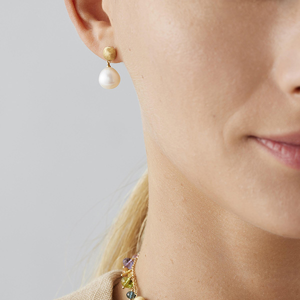 Een geelgouden oorsieraad van het merk Marco Bicego, model Africa - OB11011-PL01_y-02, bezet met 2 parels.