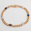 Een 18 karaats geelgouden gourmet armband uit onze vintage collectie, bezet met 30 briljant geslepen diamanten met een totaal gewicht van ca. 0,35 crt. en 3 saffieren.