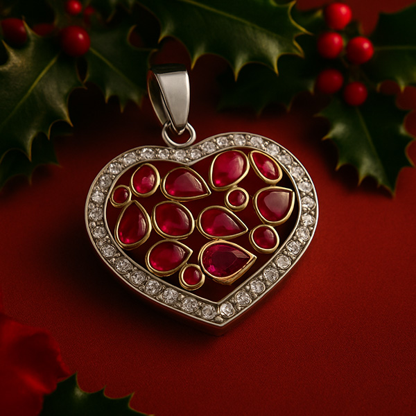 Een handgemaakte wit- met rozegouden hanger uit onze vintage collectie, bezet met 40 briljant geslepen diamanten met een totaal gewicht van ca. 1,82 crt. en diverse slijpvormen robijn.