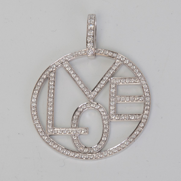 Een witgouden hanger uit onze vintage collectie, model Love, bezet met briljant geslepen diamanten.