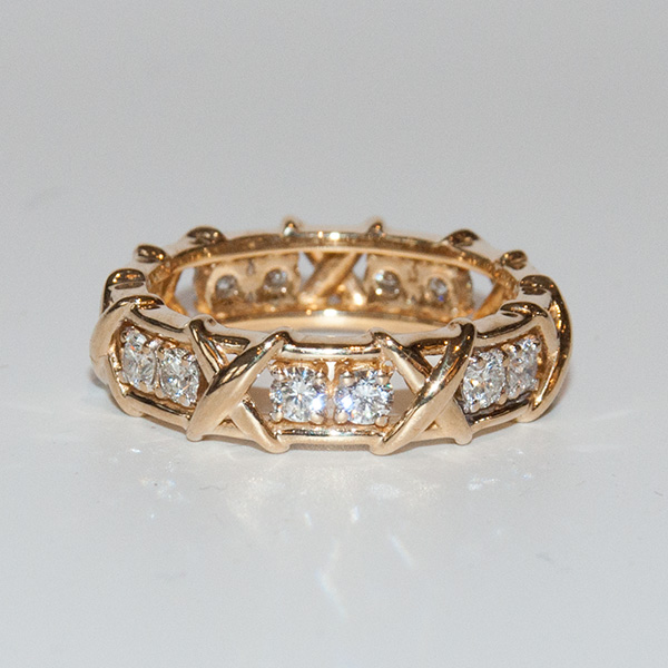 Een geelgouden ring uit onze vintage collectie, bezet met 14 briljant geslepen diamanten met een totaal gewicht van ca. 1,30 crt.